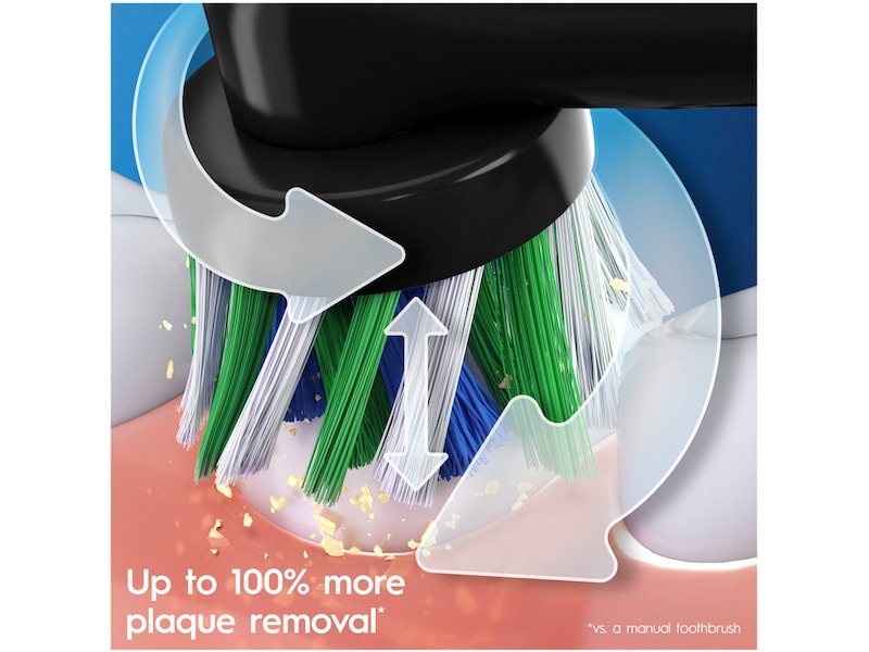 Oral-B PRO 3 kommer med ett runt borsthuvud som omsluter varje tand för renare tänder och friskare tandkött, och avlägsnar upp till 100 % mer plack jämfört med en manuell tandborste.