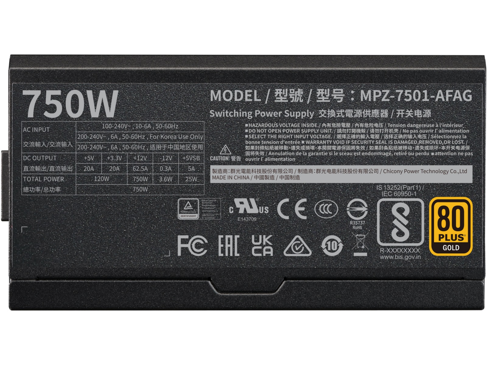 | Utmatningsström | +12V - 62.5 A, +5VSB - 3 A, -12V - 0.3 A, +3.3V - 20 A, +5V - 20 A |