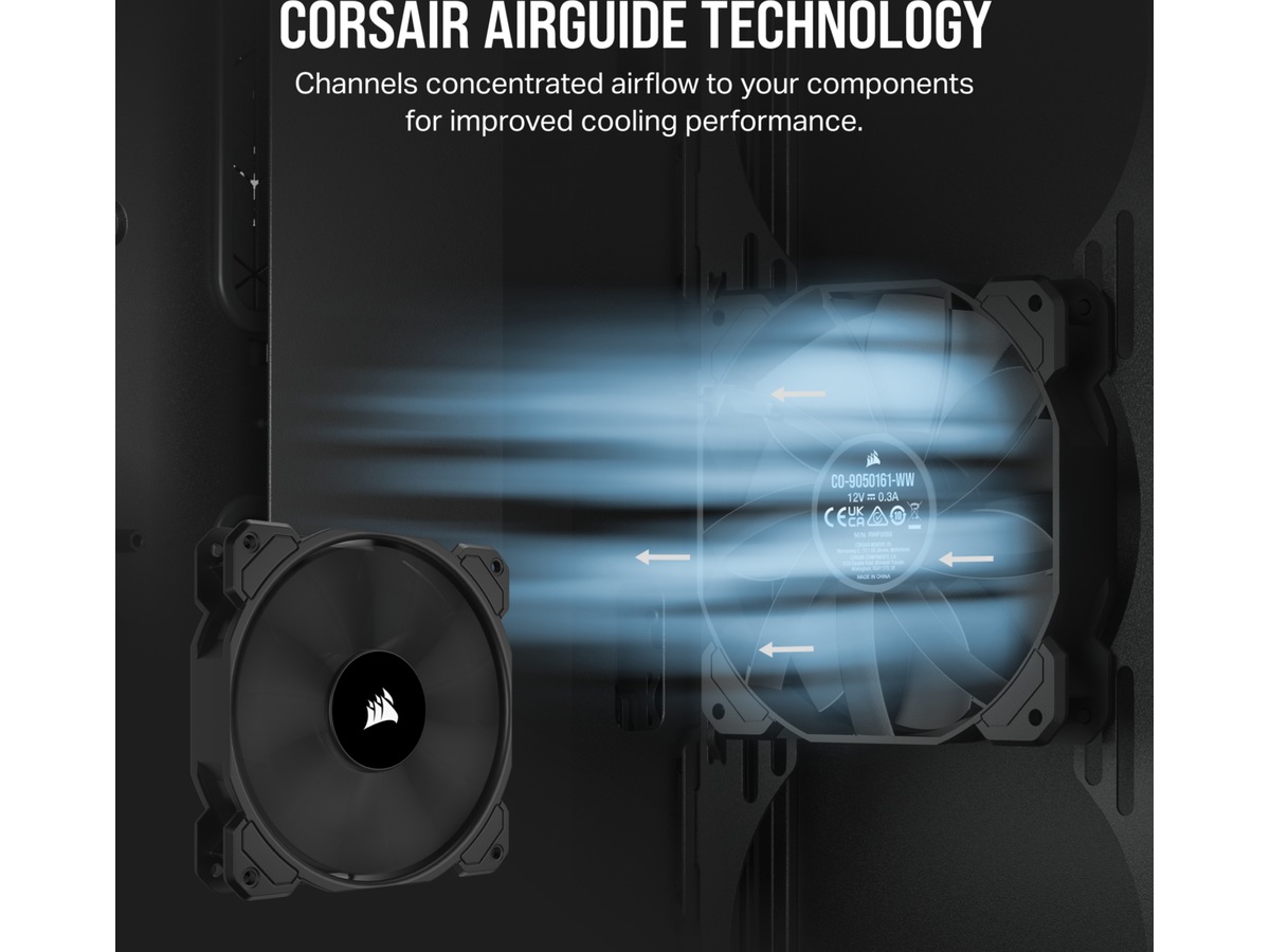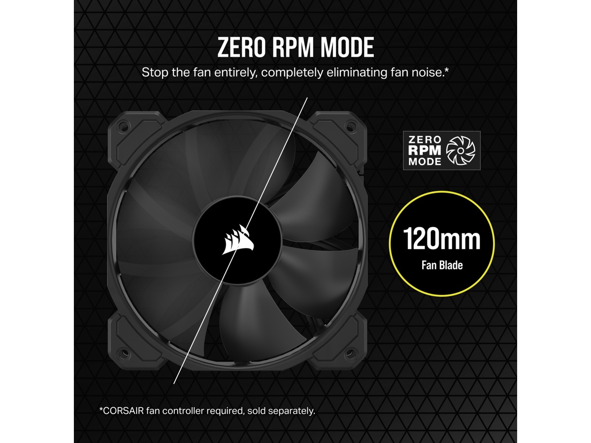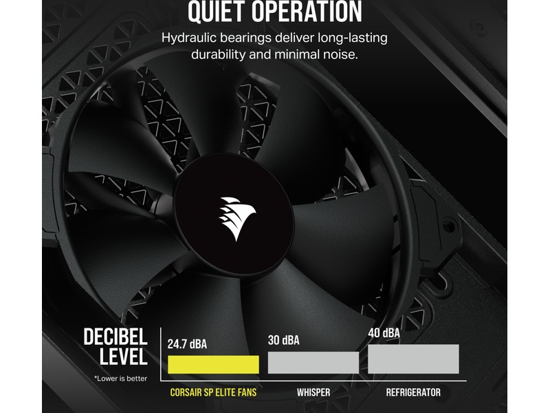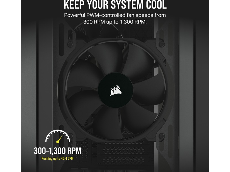 När datorn inte används kan du räkna med att CORSAIRs Zero RPM-läge eliminerar fläktljudet. Fläktarna snurrar endast när temperaturen når det tröskelvärde som du har ställt in i CORSAIRs iCUE-programvara med en CORSAIR COMMANDER fläktkontroll.*