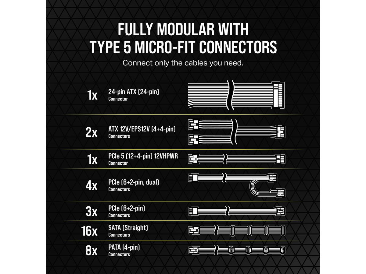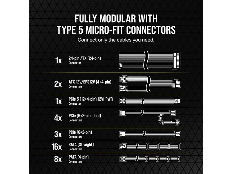 CORSAIR Type 5 Gen 1 mikroanpassade nätaggregatkablar är helt modulära, så att du bara ansluter de kablar som ditt system behöver och tar mindre plats.