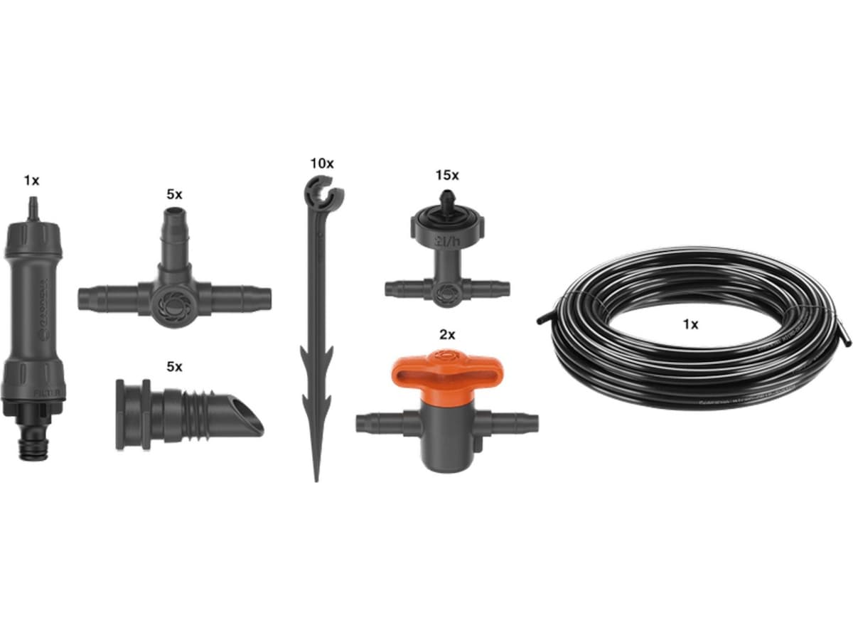Setet innehåller en huvudenhet 1000, ett 20 m långt tilloppsrör 4,6 mm (3/16"), två regler- och avstängningsventiler (3/16"), fem T-kopplingar 4,6 mm (3/16"), fem ändpluggar 4,6 mm (3/16"), tio pinnrör 4,6 mm (3/16") och 15 inline-droppmunstycken 2 l/h.