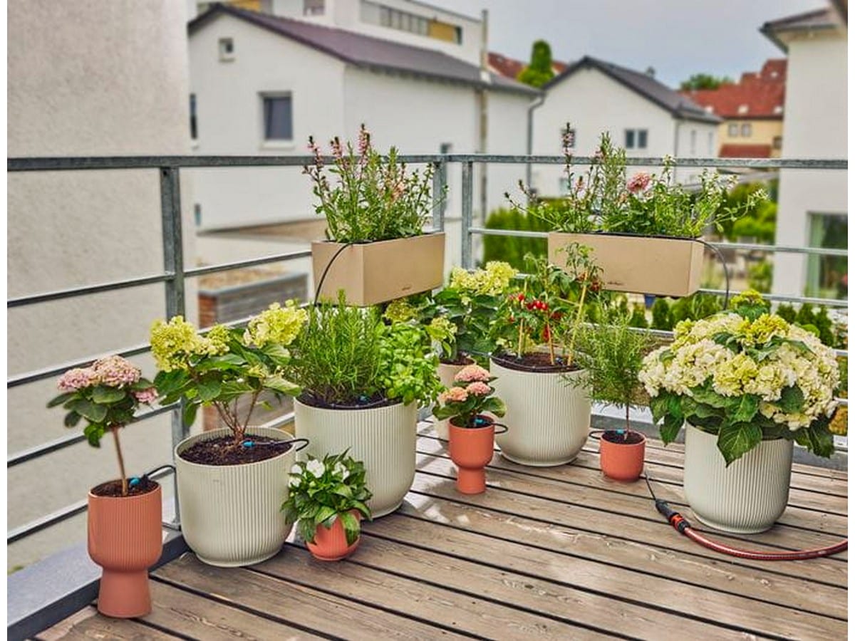 Setet säkerställer en konstant vattentillförsel även vid höjdskillnader och växter med olika vattenbehov. Den är därför idealisk för balkongförhållanden.