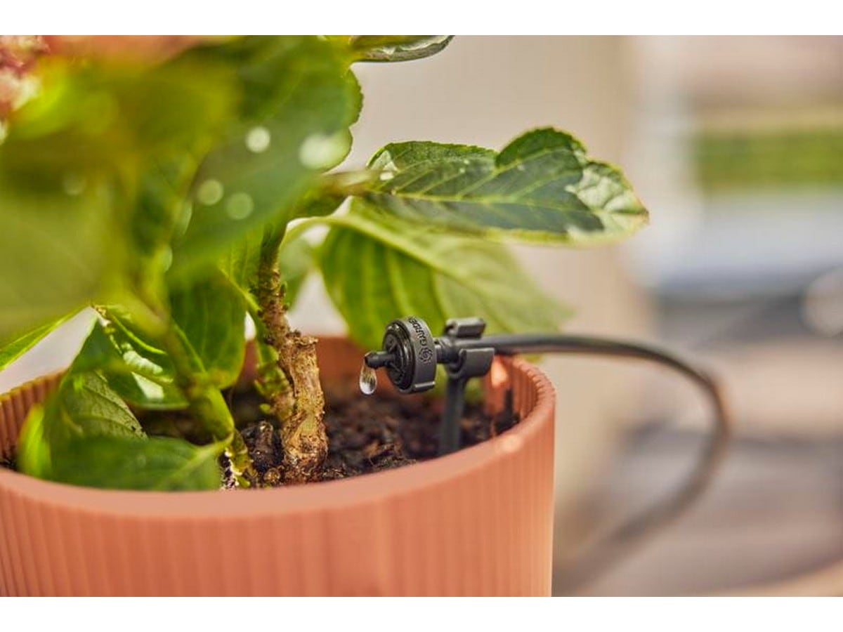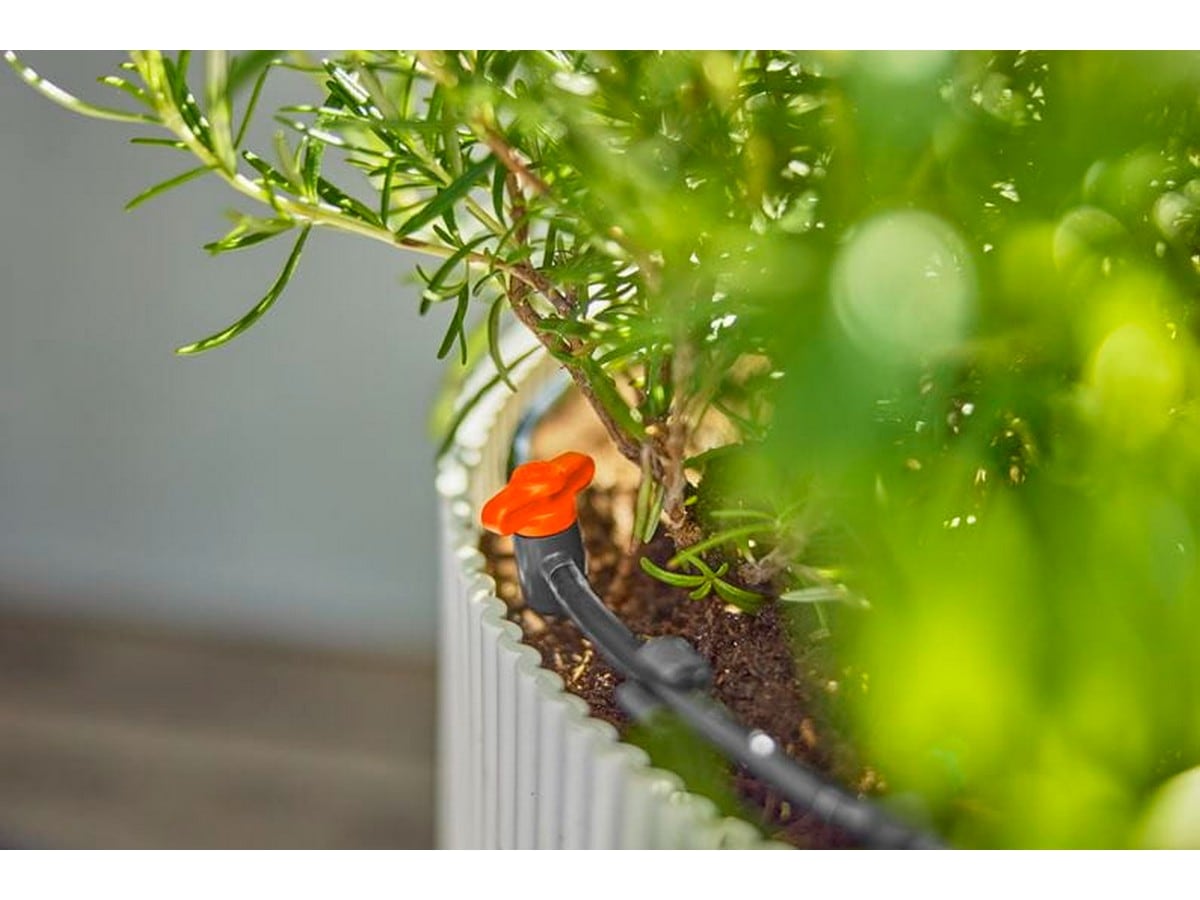 Setet är idealiskt för vattenbesparande droppbevattning av totalt 15 krukväxter med olika vattenbehov på terrassen eller plantorna – både för krukväxter och växtrader i tråg eller kar.