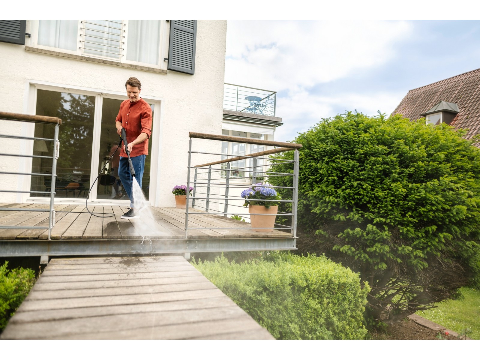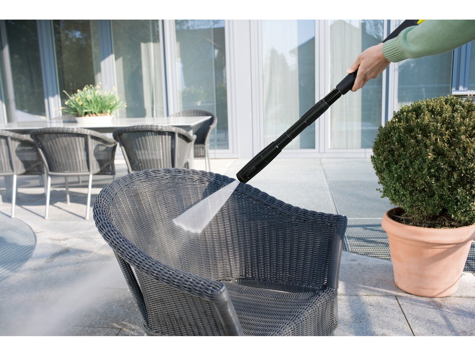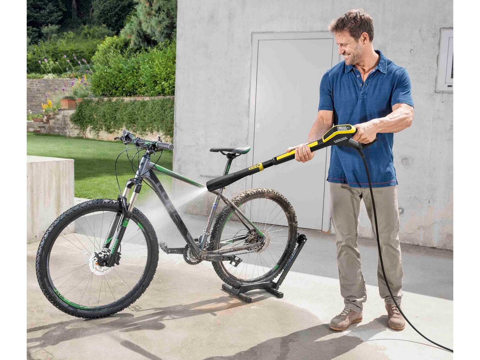 Högtryckstvätten är utrustad med en kraftfull vattenkyld motor och har en avtryckarpistol med Quick Connect snabbkopplingssystem och en 8 meter lång högtrycksslang. Det finns även en Vario Power sprutlans (VPS) som gör det enkelt att ställa in önskat tryck och ger skonsam behandling av ömtåliga ytor, samt ett sprutrör med en kraftig roterande stråle för att tackla den mest envisa smutsen. Det integrerade vattenfiltret skyddar pumpen.