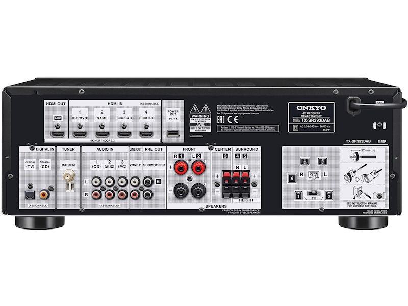 TX-SR393DAB förenklar ditt rums underhållningsinställning. Komponenter ansluts till märkta portar medan din TV ansluts via en enkel att dölja HDMI-kabel. Anslut dina högtalare enligt ett vänligt diagram bredvid de numrerade högtalarterminalerna. Installationen tar ögonblick, njutningen är obegränsad.