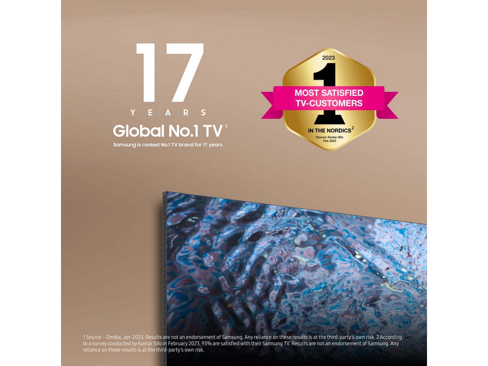* 1 Källa – Omdia, jan 2023. Resultaten är inte ett marknadsföringsbudskap från Samsung. Eventuella hänvisningar till dessa resultat sker på egen risk av tredje part. 2 Enligt en undersökning utförd av Kantar Sifo genomförd i januari 2023 är 93 % nöjda med sin Samsung TV. Resultaten är inte ett marknadsföringsbudskap från Samsung. Eventuella hänvisningar till dessa resultat sker på egen risk av tredje part. 3 Gäller vid köp av utvalda modeller av projektorer och utvalda 2023 års Samsung TV på samsung.com och hos utvalda återförsäljare under perioden 2023-04-20 – 2023-12-31. Begränsningar förekommer och streamingtjänsterbjudanden som ingår kan variera under kampanjen. Kräver att kund skapar konto hos aktuell streamingtjänst. Samsung kan visa reklam och kampanjer på Smart TV-gränssnittet och applikationer. Tillgänglighet av appar kan variera över tid och region. Villkor: samsung.com/se/tvs/smart-tv/smart-start. 4 Garantin gäller i 10 år från inköpsdatumet. Kräver en kopia av inköpskvittot och registreringen på Samsungs webbplats inom 90 dagar efter köpet. Gäller för köp av utvalda 2023 TV-modeller mellan 20.04.2023 – 31.03.2024.
