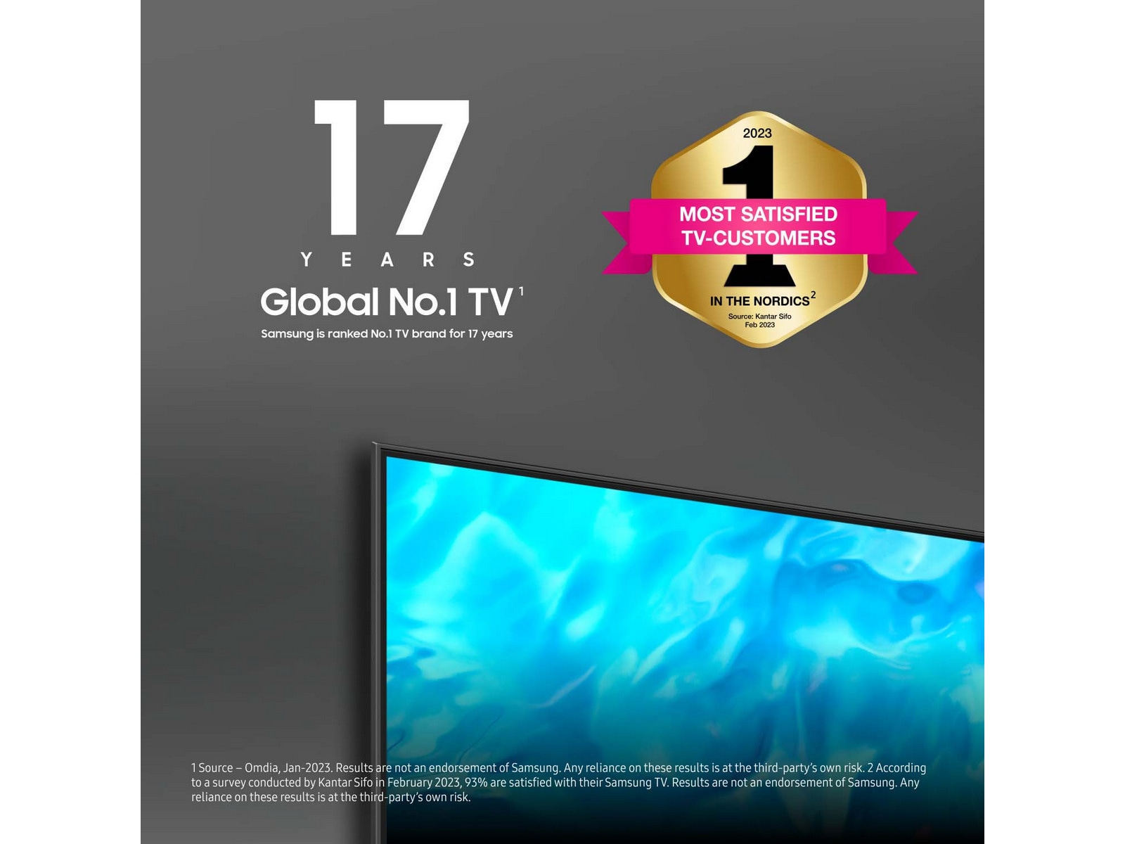 - Enligt en undersökning utförd av Kantar Sifo genomförd i januari 2023 är 93 % nöjda med sin Samsung TV. Resultaten är inte ett marknadsföringsbudskap från Samsung. Eventuella hänvisningar till dessa resultat sker på egen risk av tredje part.