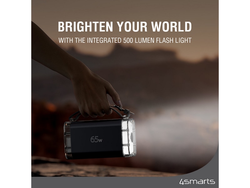 Vår 65W powerbank är inte bara en kraftfull laddare för på språng, utan har även en integrerad ficklampa med en ljusstyrka på 500 lumen. Ficklampan är utrustad med tre olika ljusstyrkanivåer, så den kan anpassas för alla situationer. Från en mjuk belysning för läsning till en stark och kraftfull belysning för utomhusaktiviteter - powerbanken erbjuder ett brett utbud av inställningar.