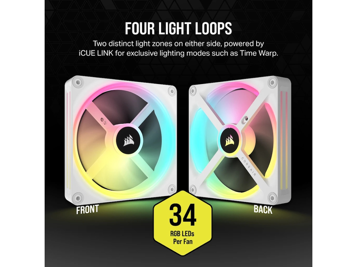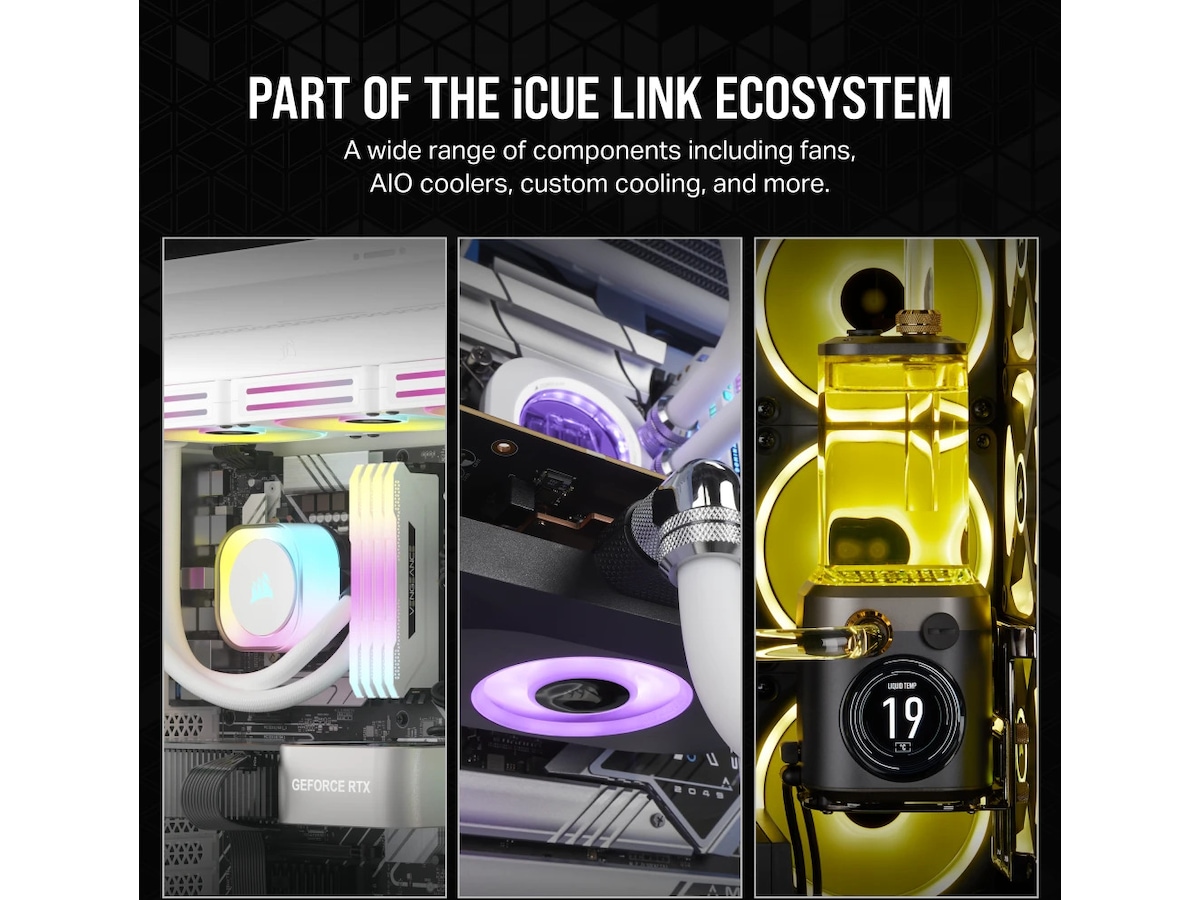 Lys upp ditt system från vilken vinkel som helst och använd exklusiva belysningslägen som den stroberande Time Warp. Dra fördel av smarta komponentfunktioner som temperatursensorer och tvåvägskommunikation med iCUE LINK System Hub.