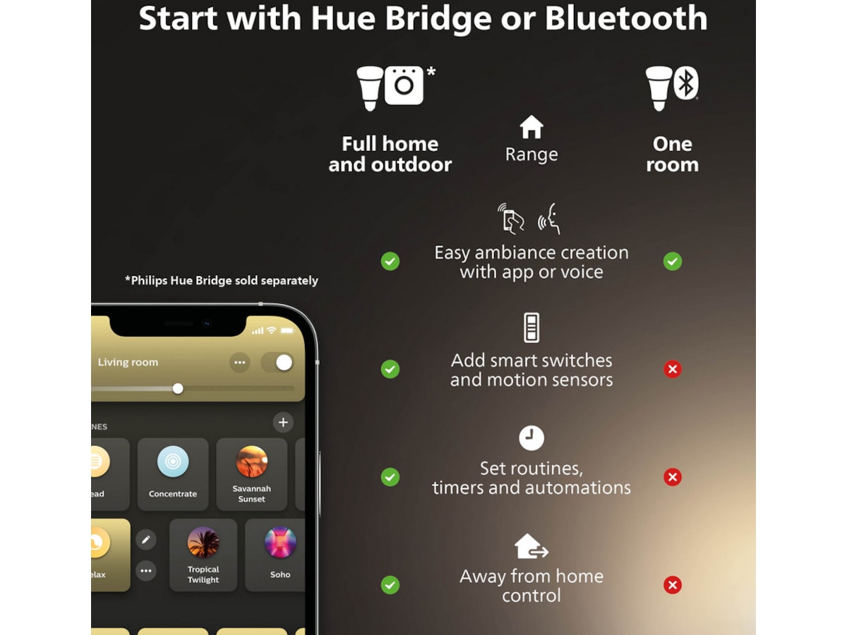 - Få tillgång till hela utbudet av smarta belysningsfunktioner med Hue Bridge