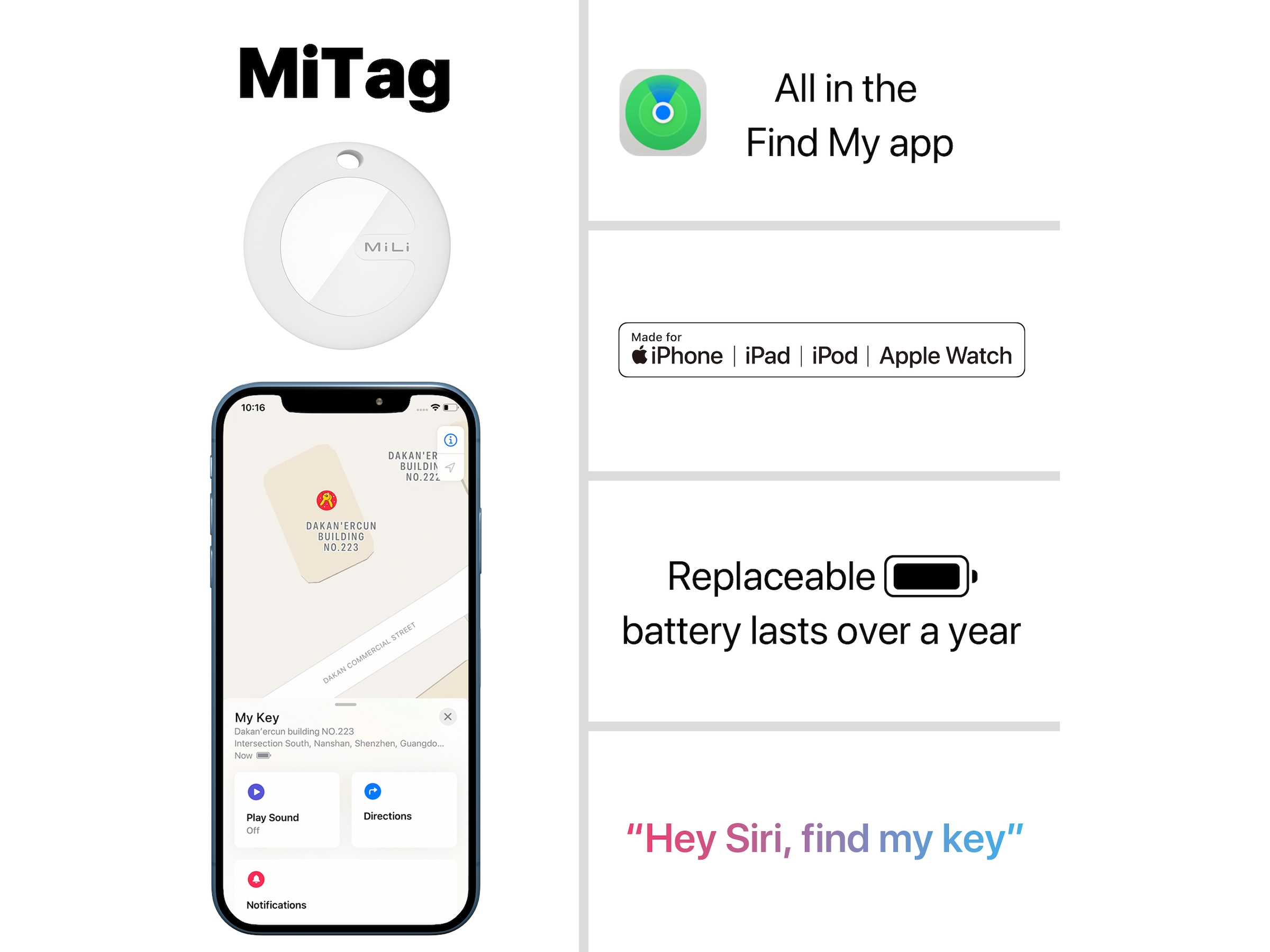 Tack vare MiTag-spårningsenheten kan du spåra ditt husdjur även över långa avstånd, och ett CR2032-batteri (ingår i förpackningen) ger enheten en livslängd på upp till 12 månader.