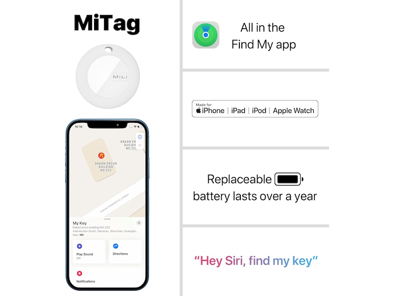Tack vare MiTag-spårningsenheten kan du spåra ditt husdjur även över långa avstånd, och ett CR2032-batteri (ingår i förpackningen) ger enheten en livslängd på upp till 12 månader.