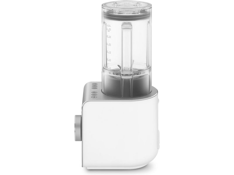En praktisk uppsättning tillbehör kompletterar produkten, vilket gör den ännu enklare att använda. Tampern kan användas för att transportera ingredienser till det centrala skärområdet, vilket är idealiskt för tjockare rätter som torkat fruktsmör eller kalla desserter; spateln hjälper till att samla upp matrester inuti kannan. Slutligen kan den medföljande borsten användas för att försiktigt ta bort eventuella matrester från bladområdet.