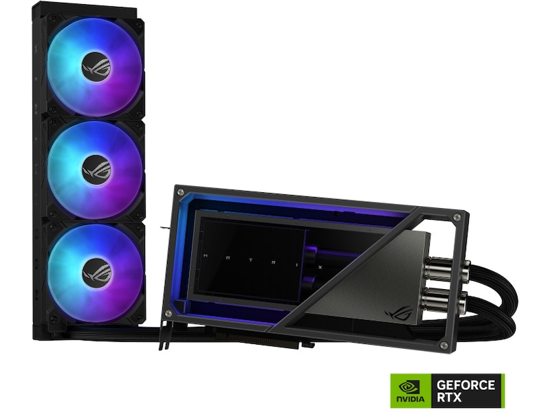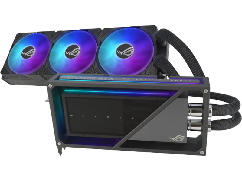ROG Matrix GeForce RTX™ 4090 levererar absolut toppprestanda samtidigt som den bibehåller tyst termisk drift, via flytande termisk metallblandning på GPU-matrisen, en förstklassig 360 mm AIO-kylare och en fantastisk ihålig metallramdesign.