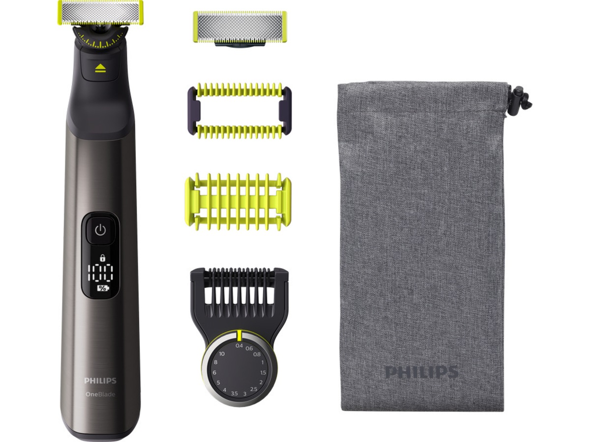 Philips OneBlade Pro Face + Body trimmar, trimmar och rakar alla hårlängder. Du får ett blad för ansiktet och ett med hudskydd för kroppen. Inga fler redskap behövs. OneBlade gör jobbet.