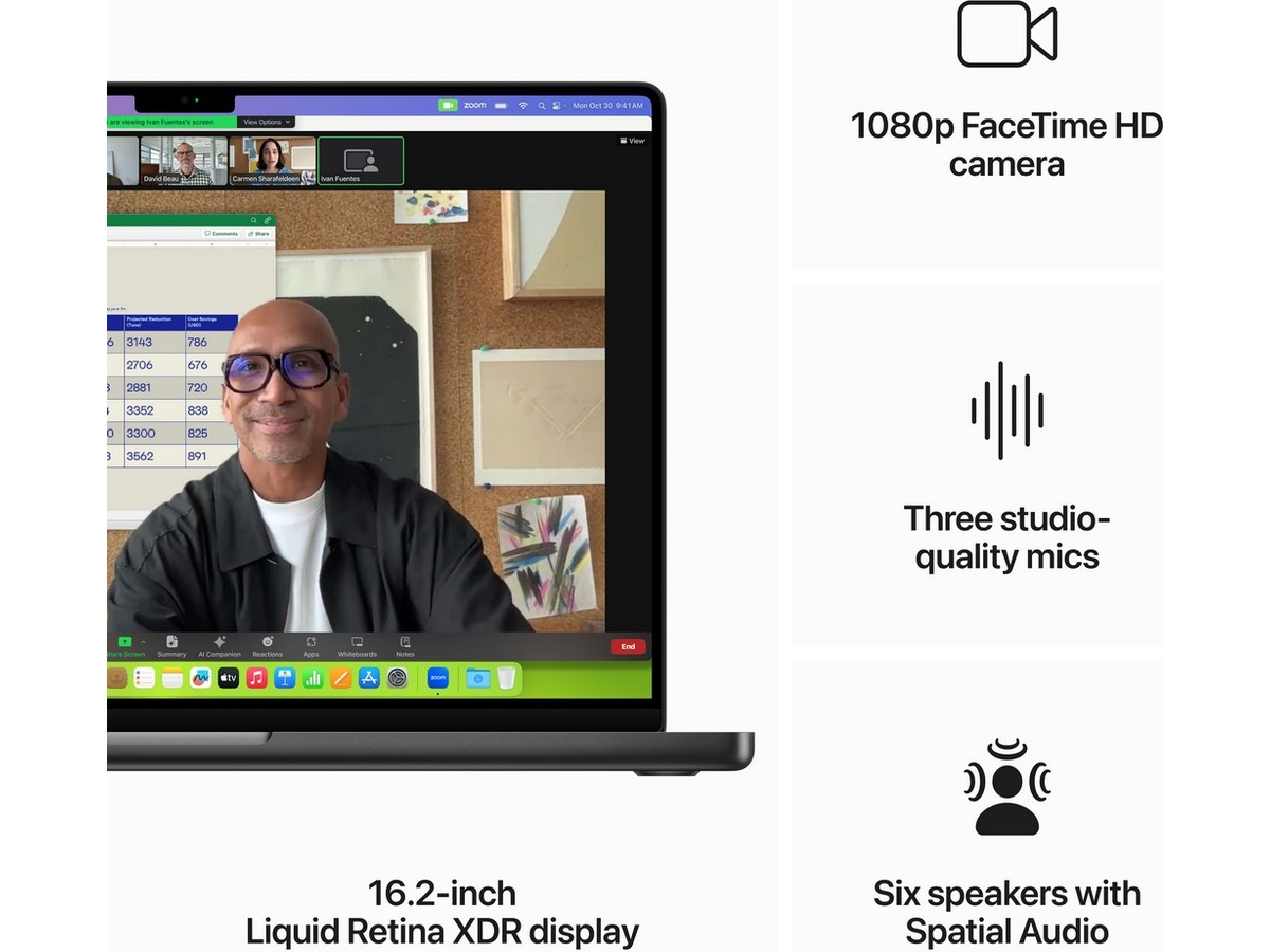 - AVANCERAD KAMERA OCH LJUD – Visa din bästa sida med en 1080p FaceTime HD-kamera, tre mikrofoner av studiokvalitet och sex högtalare med rumsmatchat ljud.