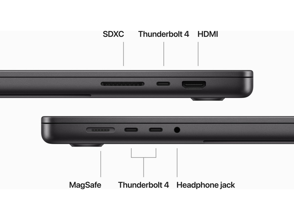 - ANSLUTA TILL ALLT – Denna MacBook Pro har en MagSafe-laddningsport, tre Thunderbolt 4-portar, en SDXC-kortplats, en HDMI-port och ett hörlursuttag. Få snabb trådlös anslutning med WiFi 6E (5) och Bluetooth 5.3. Och du kan ansluta upp till två externa skärmar med M3 Pro, eller upp till fyra med M3 Max.
