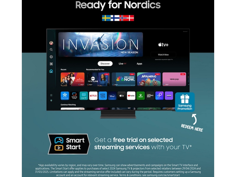 *Gäller vid köp av utvalda modeller av projektorer och utvalda 2024 års Samsung TV på samsung.com och hos utvalda återförsäljare under perioden 2024-04-29 – 2025-03-31. Begränsningar förekommer och streamingtjänsterbjudanden som ingår kan variera under kampanjen. Kräver ett Samsung-konto samt att kund skapar konto hos aktuell streamingtjänst. Villkor: samsung.com/se/smartstart