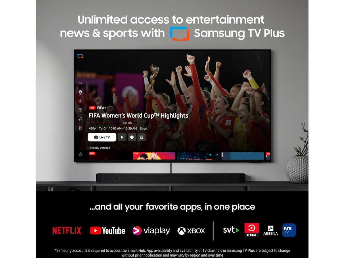 - Kostnadsfri tillgång till film, serier, sport och nyheter med Samsung TV Plus.