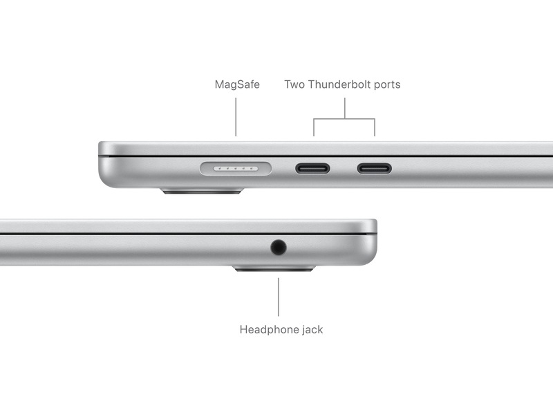 - HELT ANSLUTEN – MacBook Air har två Thunderbolt-portar, ett hörlursuttag, wifi 6E,(4) Bluetooth 5.3 och en MagSafe-laddningsport. Anslut upp till två externa bildskärmar med maskinen stängd.