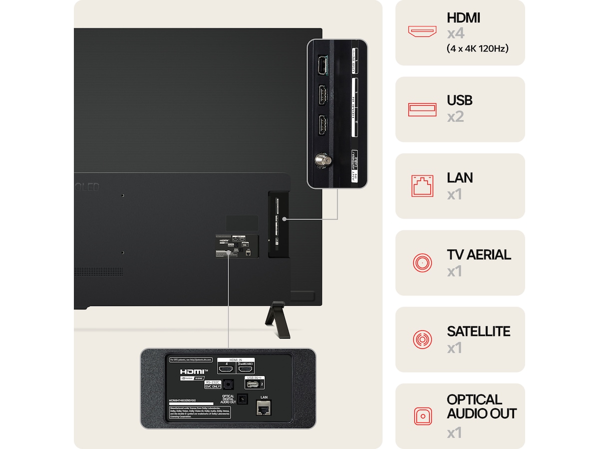 | Egenskaper | Apple AirPlay 2-stöd, 4K High Frame Rate (HFR), Game Dashboard, Freesync, AI-genreval, Alltid redo, Familjeinställningar, AI Picture Wizard, G-SYNC Compatible, AI Concierge, Cloud Gaming, Stöd för USB-webbkamera, AI Brightness Control |