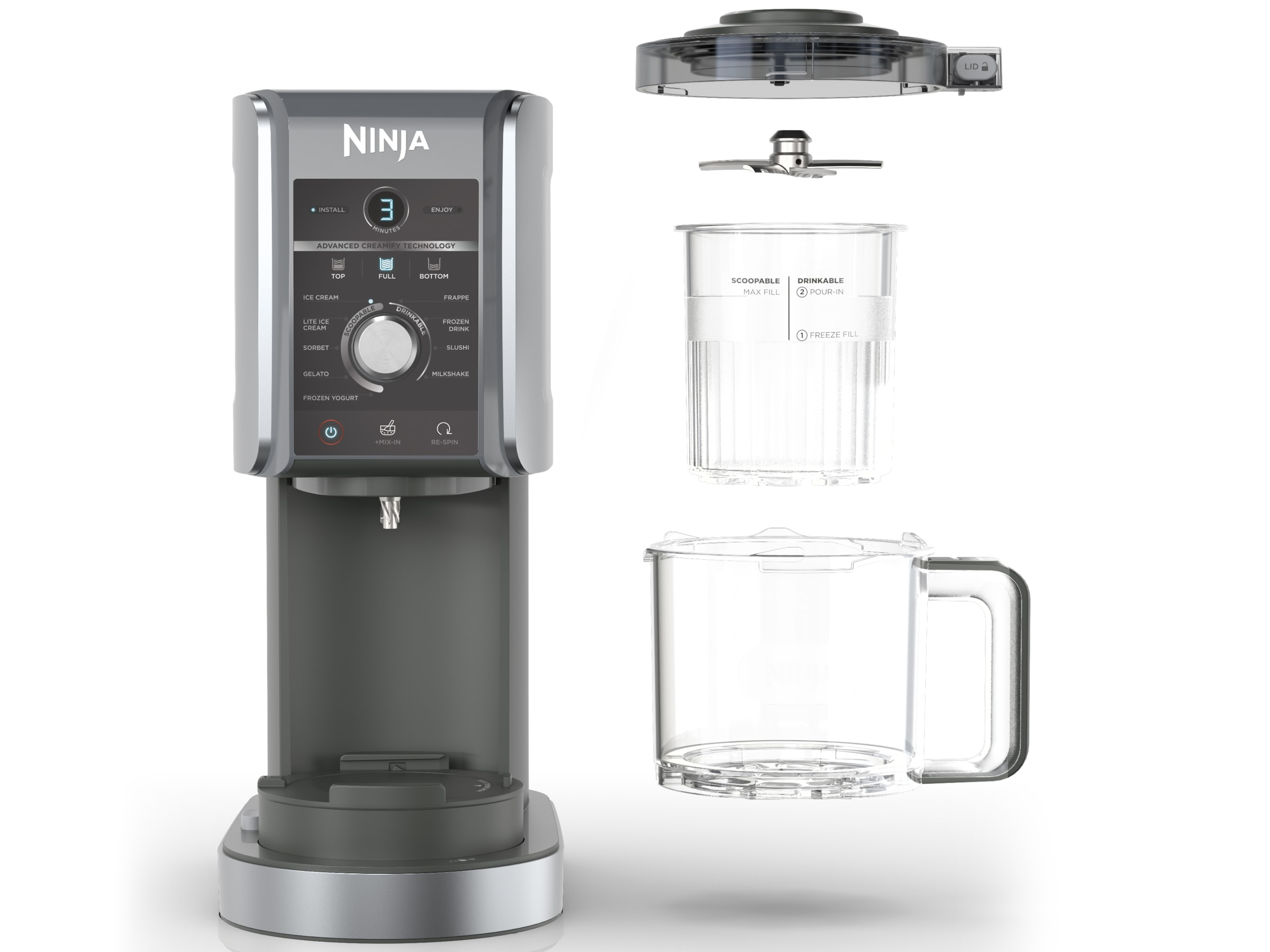 Ninja CREAMi Deluxe innehåller 10 program: Glass, Sorbet, Lättglass, Gelato, Milkshake, Mix-In, Frappe, Frozen Drink, Slushi & Frozen Yoghurt. De avtagbara delarna, inklusive Deluxe badkar och lock, ytterskål, lock och paddel, tål diskmaskin för enkel rengöring.