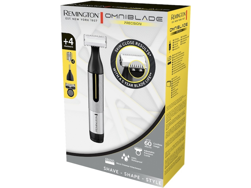 Njut av komplett ansiktsprecisionsstyling och hudnära resultat med Omniblade Precision. Det avtagbara huvudet och 3 utbytbara tillbehör ger dig allt du behöver för att skapa en mängd olika stilar. Med en ny stämplad och jordad bladdesign får du en nära skärprestanda på bara 0,15 mm* och bladen är garanterade att hålla i upp till 5 år**. Använd den 60-minuters sladdlösa användningstiden för att fullända ditt utseende samtidigt som du drar nytta av den intuitiva designen som ger dig fullständig kontroll.