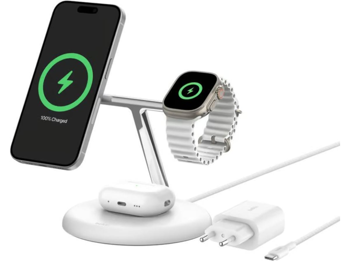 Belkin 3-i-1 Qi2 15w trådlös laddningsstation (vit)