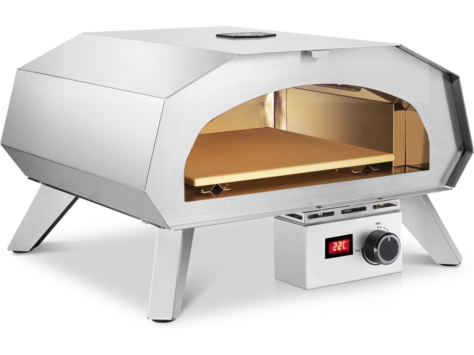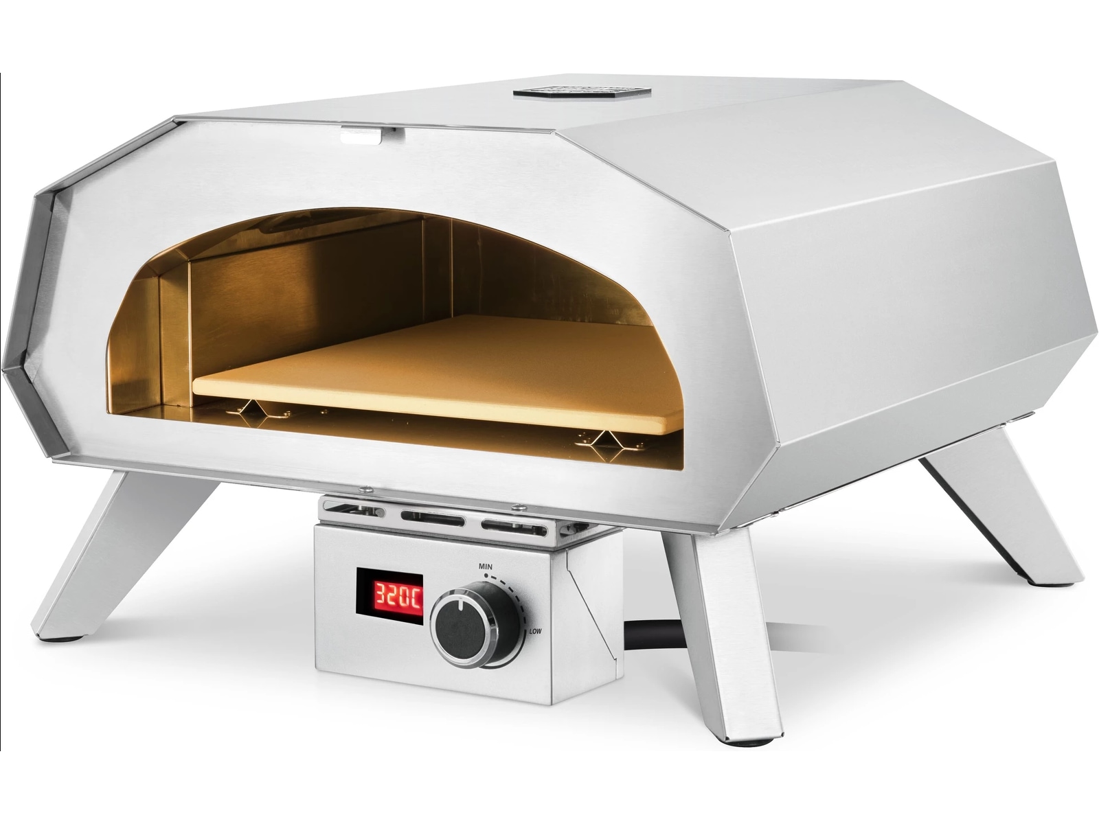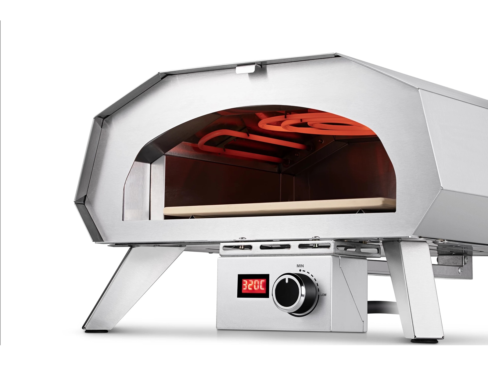 I ugnens tak finns det ett effektivt värmeelement som snabbt får pizzaugnen upp i hög temperatur. Tack vare den medföljande pizzastenen (som måste stå i ugnen medan den värms upp) fördelas värmen jämnt och pizzan bakas lika på alla sidor.