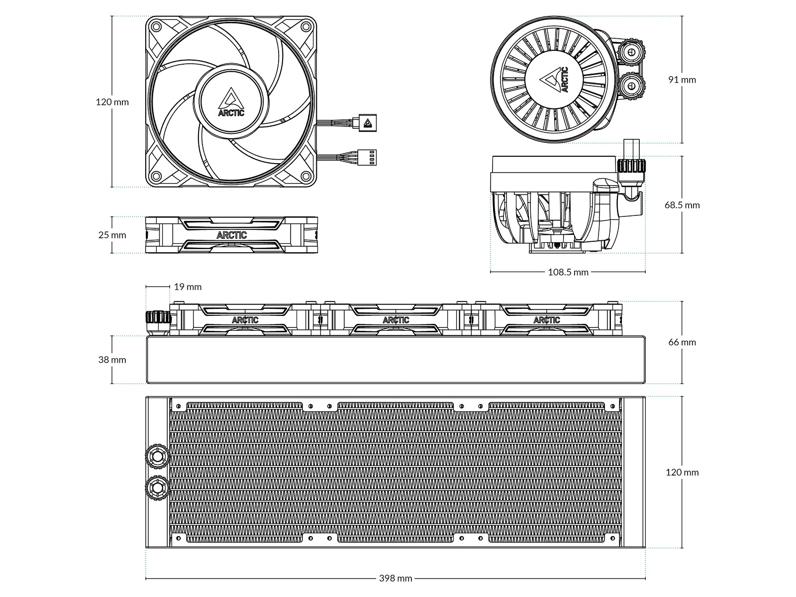 Med splitterkabeln kan pumpen, VRM-fläkten och radiatorfläktarna styras separat eller synkroniseras via en enda PWM-signal med all-in-one-kabeln.
