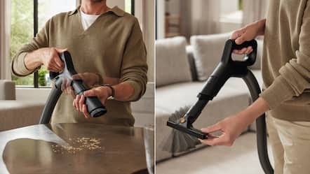 Smart rengöringstillbehör: Det platsbesparande 2-i-1 möbel- och fogmunstycket är snabbt och lätt att använda.