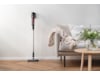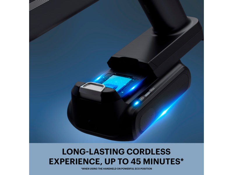 X-pert 7.60 har en lång batteritid på upp till 45 minuter**. För att ladda batteriet sätter du dammsugaren i laddstationen som monteras på väggen. Den har också förvaring för de medföljande tillbehören. Vill du inte ha dammsugaren på väggen? Förvara skaftdammsugaren i ett litet skåp genom att snabbt och enkelt dela den i flera delar.