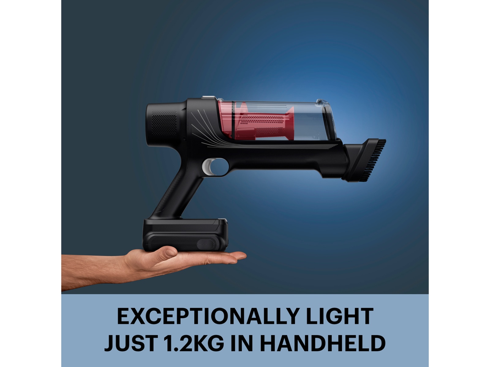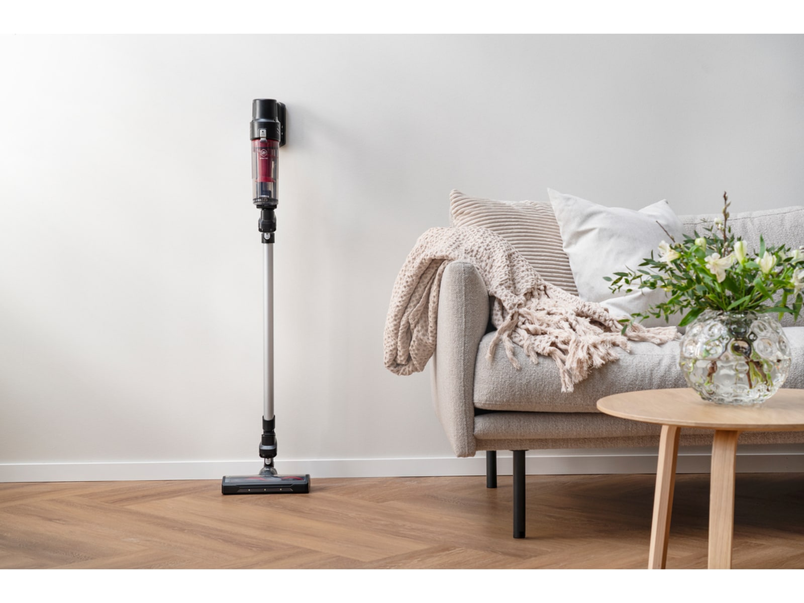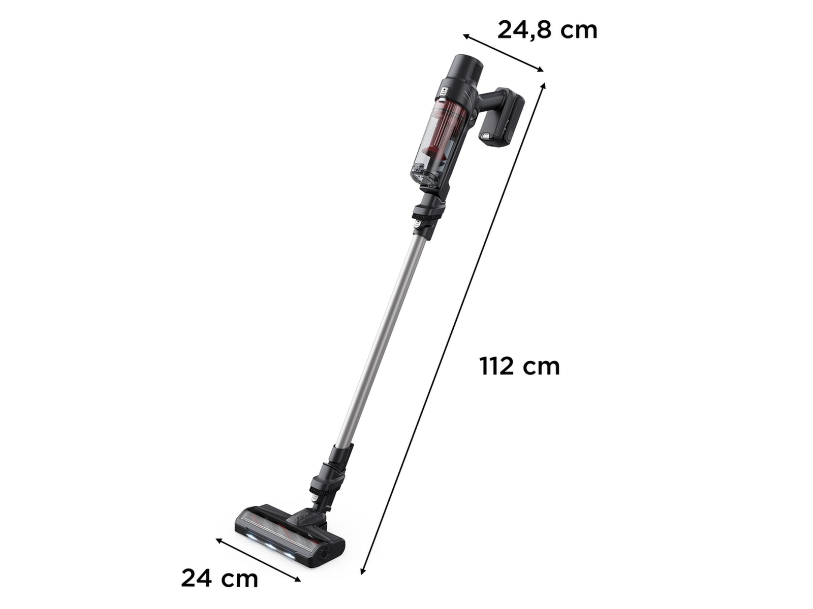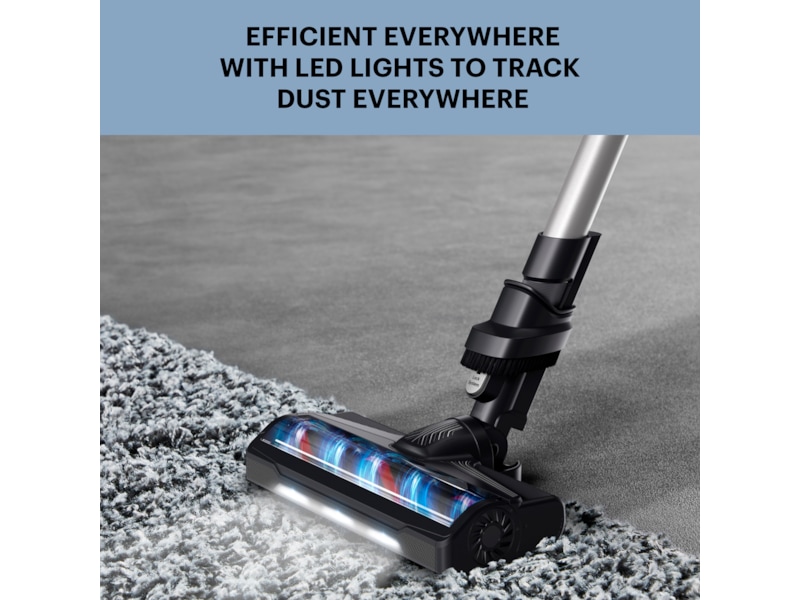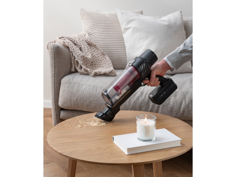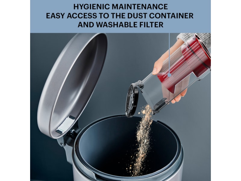 Skaftdammsugaren har en transparent dammbehållare, så du enkelt ser om du råkar suga upp något. Dammbehållaren har kapacitet på 0,44 liter, och den kan enkelt tömmas i soptunnan. Den generösa storleken på dammbehållaren gör att du slipper tömma den ofta. Tips – skölj behållaren när du har tömt den, så håller den sig fräsch.