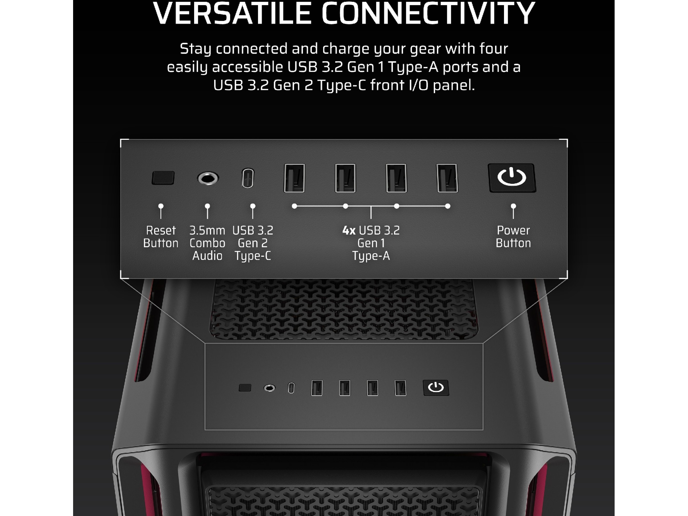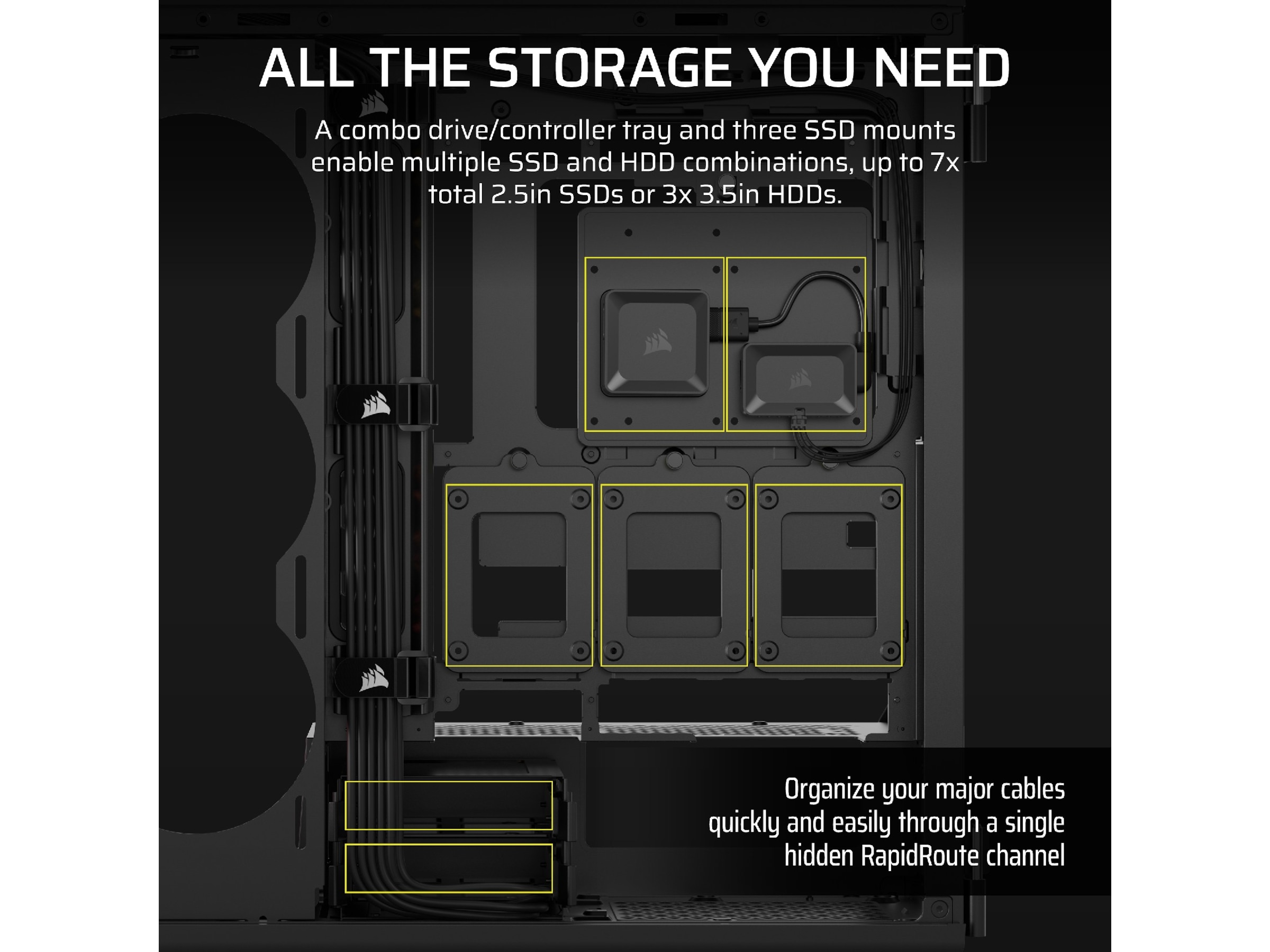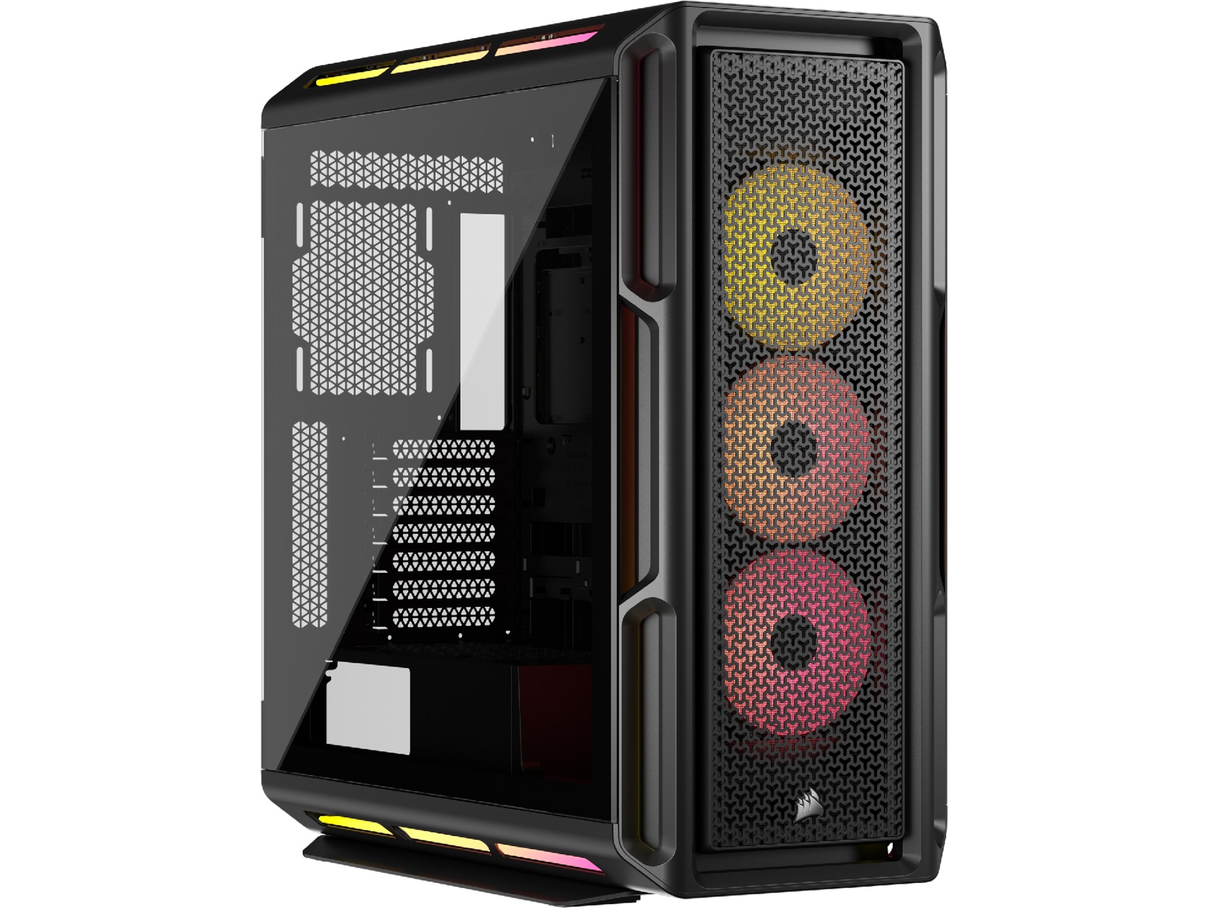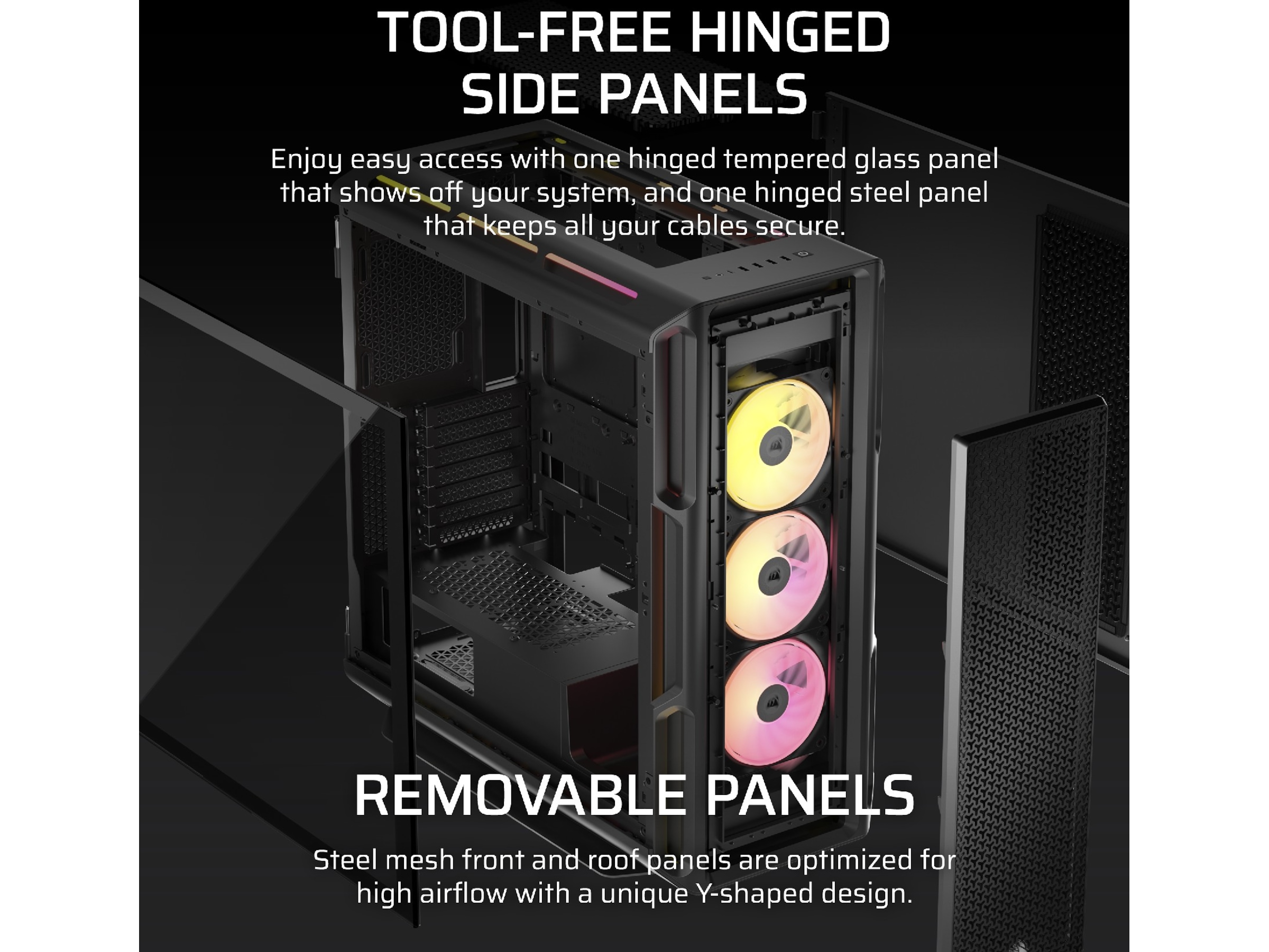 Egenskaper hos systemkabinett återställningsknapp, Borttagbar övre panel, Verktygsfri enhet, CORSAIR iCUE Aurora RGB-ljusremsor, Borttagbar frontpanel, Strömknapp, Gummigenomföringar för kabelhål, Sidopaneler med gångjärn, RapidRoute kabelhanteringssystem (46 mm fritt utrymme), CORSAIR QuikTurn fläktskruvar