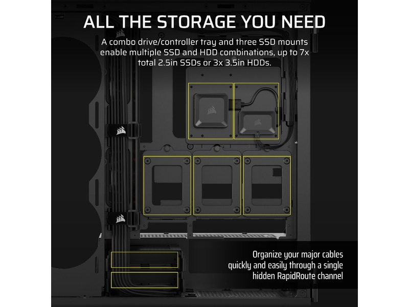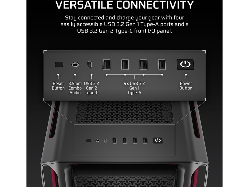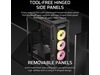 Egenskaper hos systemkabinett återställningsknapp, Borttagbar övre panel, Verktygsfri enhet, CORSAIR iCUE Aurora RGB-ljusremsor, Borttagbar frontpanel, Strömknapp, Gummigenomföringar för kabelhål, Sidopaneler med gångjärn, RapidRoute kabelhanteringssystem (46 mm fritt utrymme), CORSAIR QuikTurn fläktskruvar
