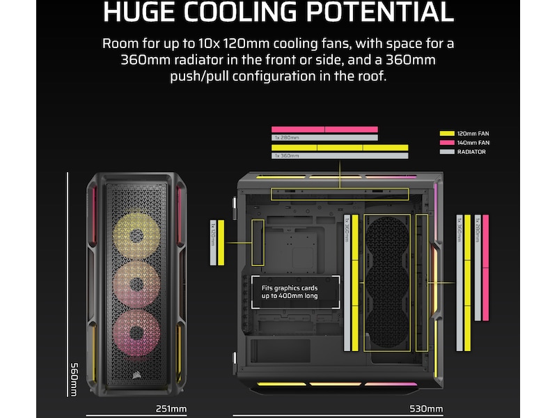 Kylsystem Ovansidan: 120 mm fläktmontering x 3 / 2 x 140 mm fläkt eller 240/280/360 mm kylare stöds, Sida: 120 mm fläktmontering x 3 / 240/360 mm kylare stöds, Bakre: 120 mm fläktmontering x 1 / 120 mm kylare stöds, Front: 120 mm fläkt x 3 / RGB-fläkt, 2 x 140 mm fläkt eller 240/280/360 mm radiator stöds