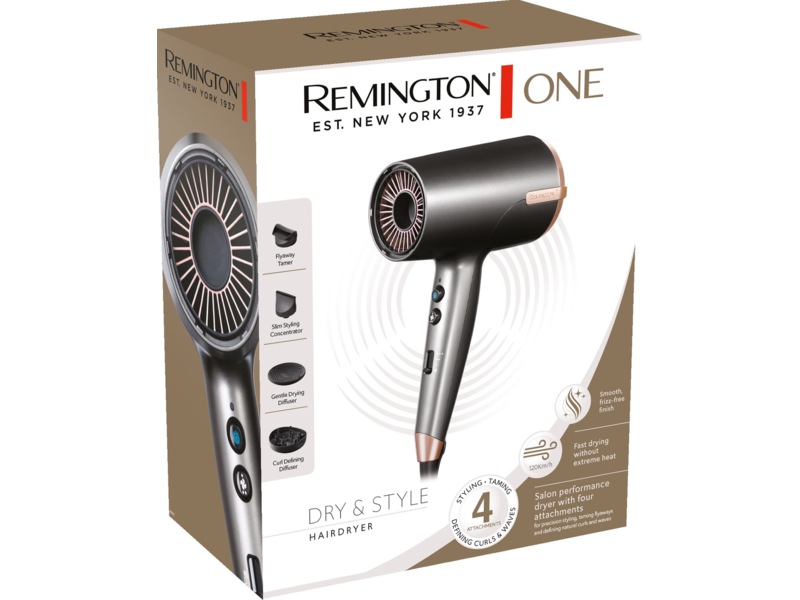 Med Remington ONE Dry Style Hairdryer behöver du inte lägga mer tid än nödvändigt på att föna håret. Denna fön har en högpresterande motor som genererar en lufthastighet på upp till 120 km/h.