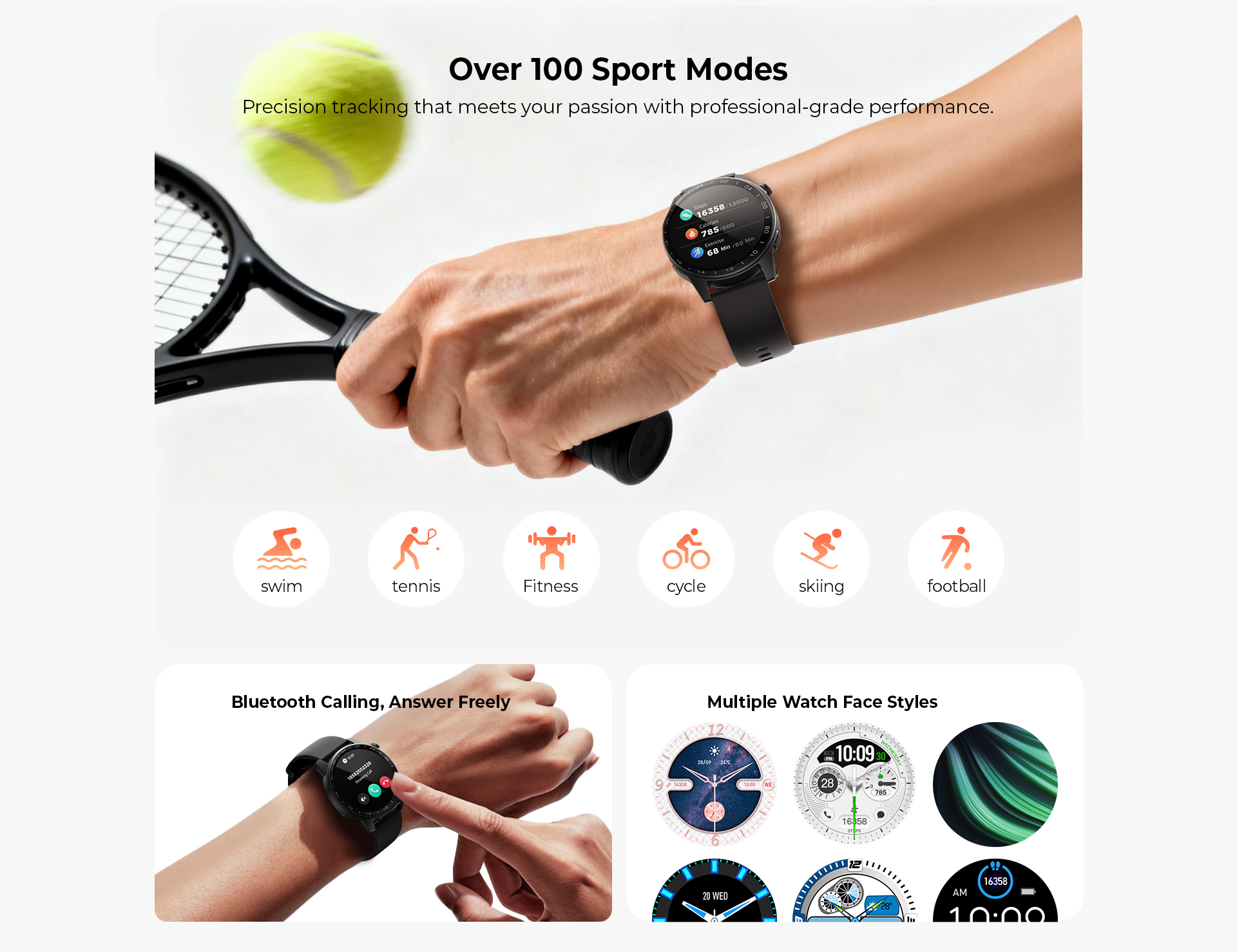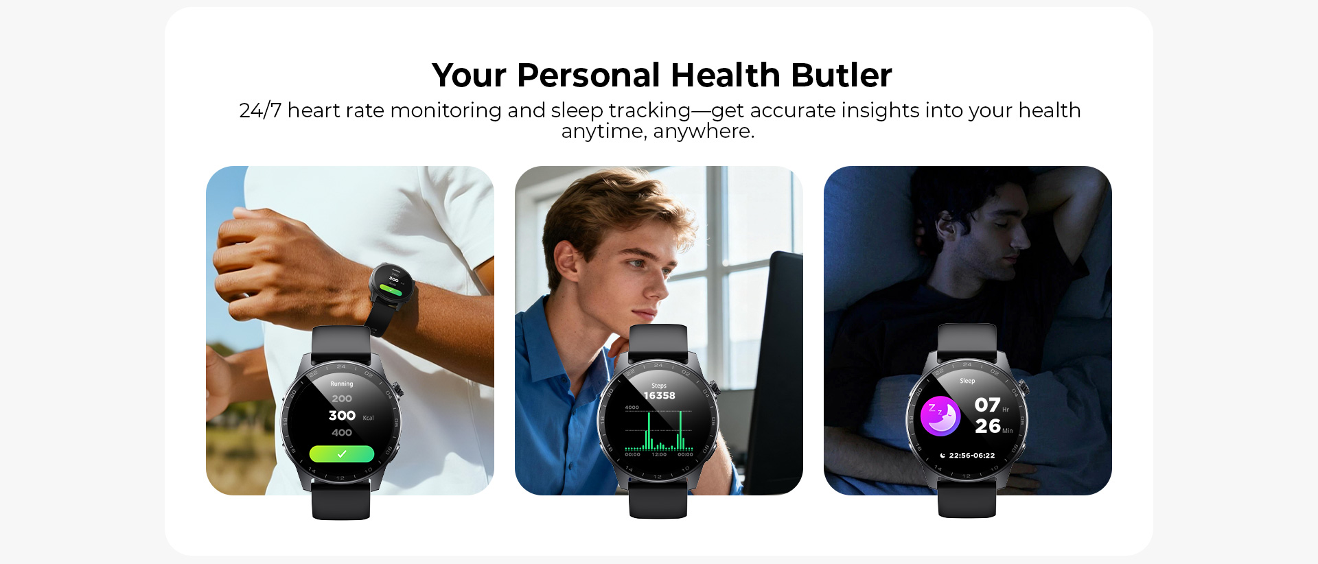 Smartwatchen erbjuder avancerad pulsmätning, detaljerad sömnanalys och flera träningslägen utformade för att optimera måluppfyllelse. Den ger värdefulla insikter i användarens aktivitetsmönster och stödjer en balanserad livsstil.