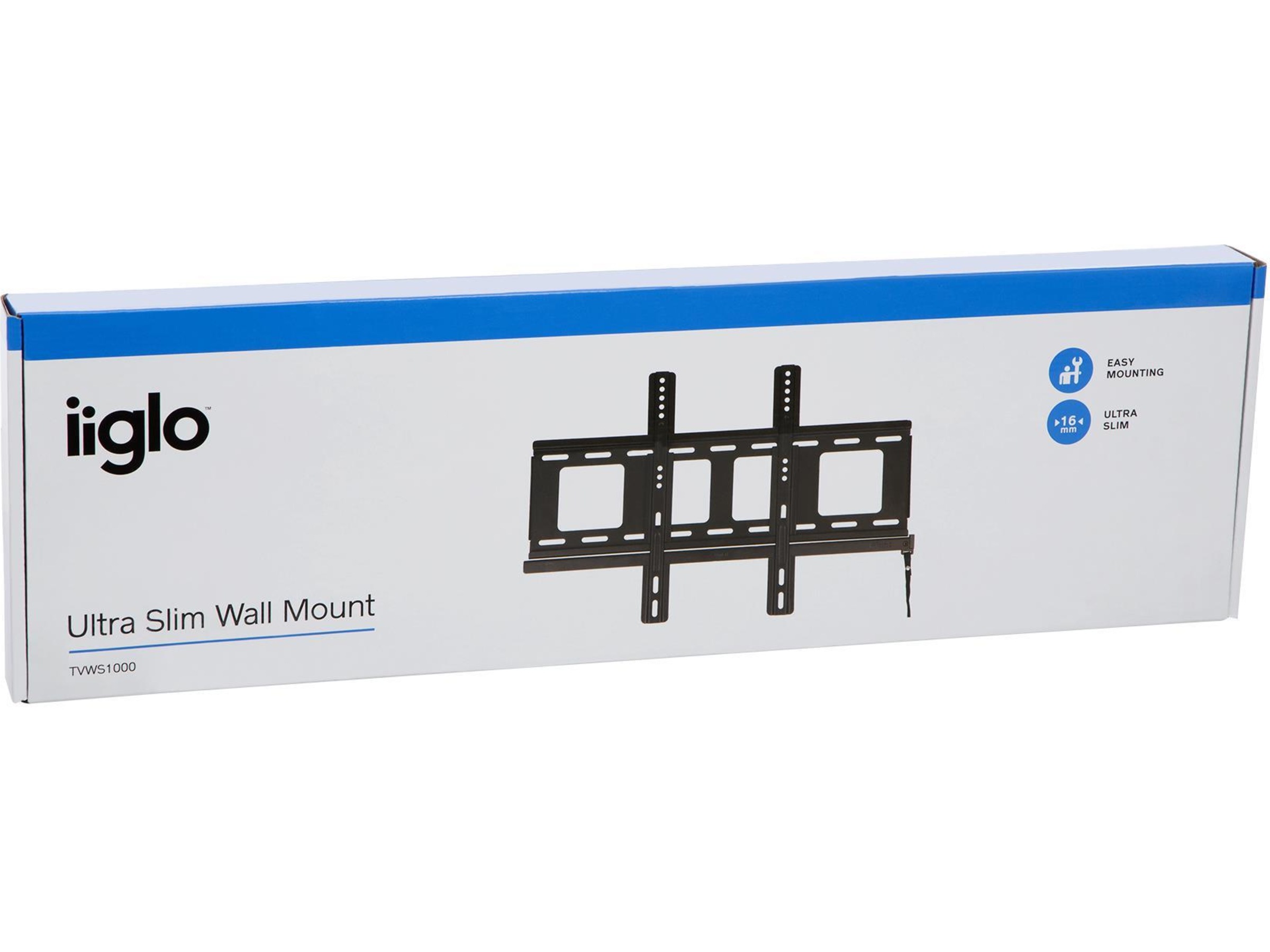 iiglo TVWS1000 är ett ultraslimmat väggfäste utformat för 32''-65'' plattskärmar. Det är gjort av svartlackerat stål och tål en maximal vikt på 45 kg. Fästet stödjer universell VESA-standard upp till 600x400 och kan monteras på TV-skärmar med böjd eller platt baksida.